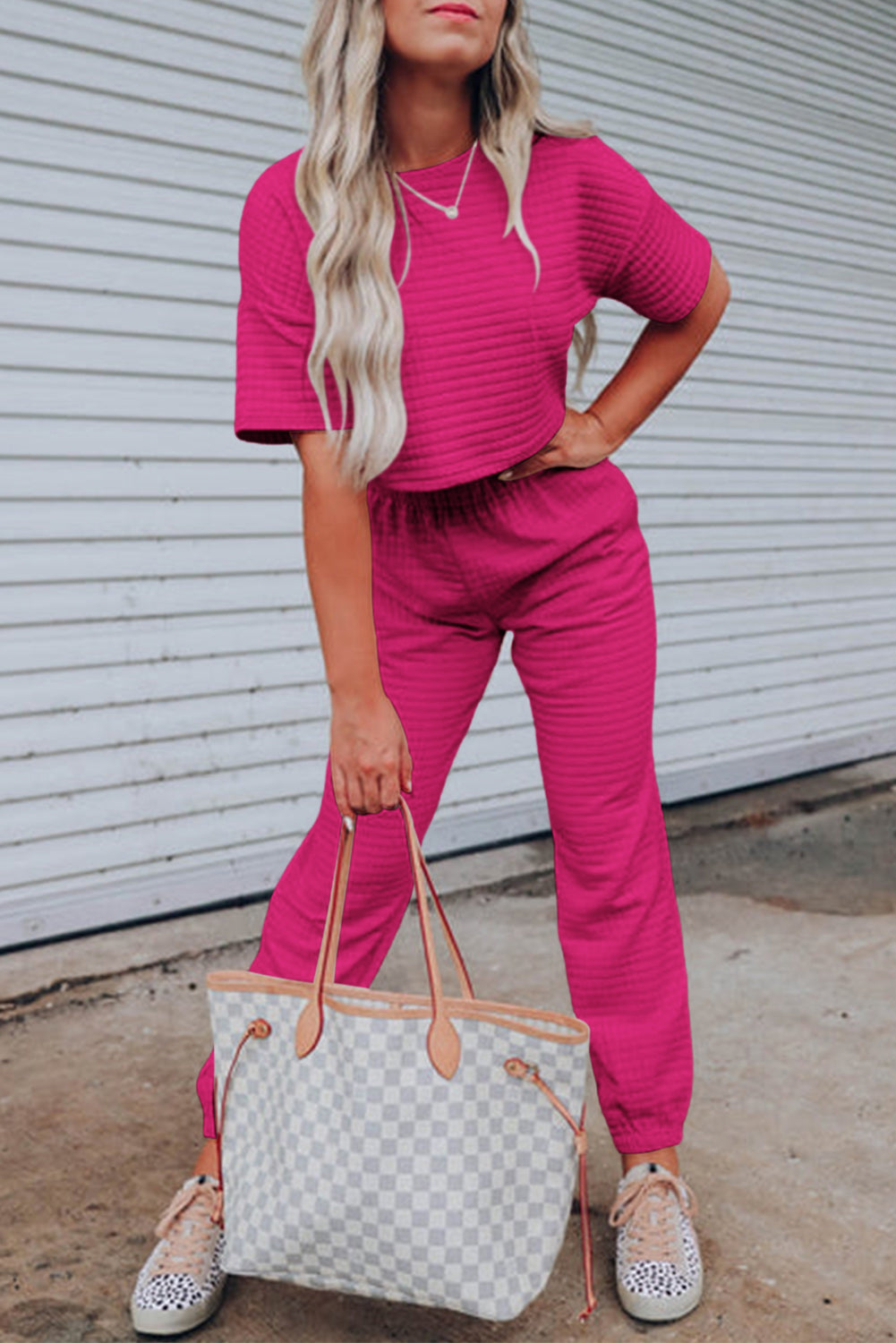 Rose Red Lattice Textured Cropped Tee and Jogger Pants Set