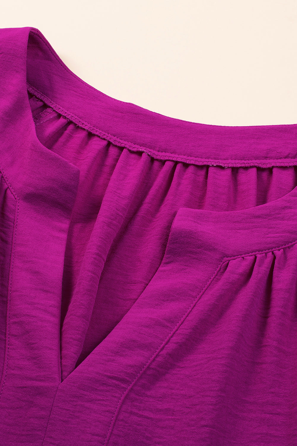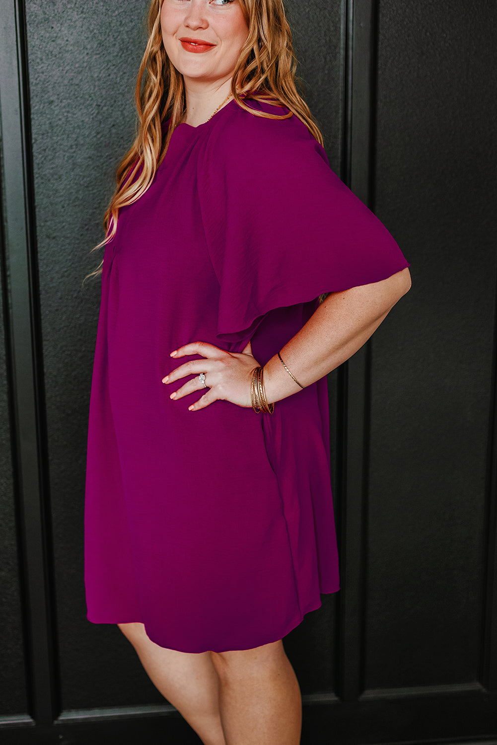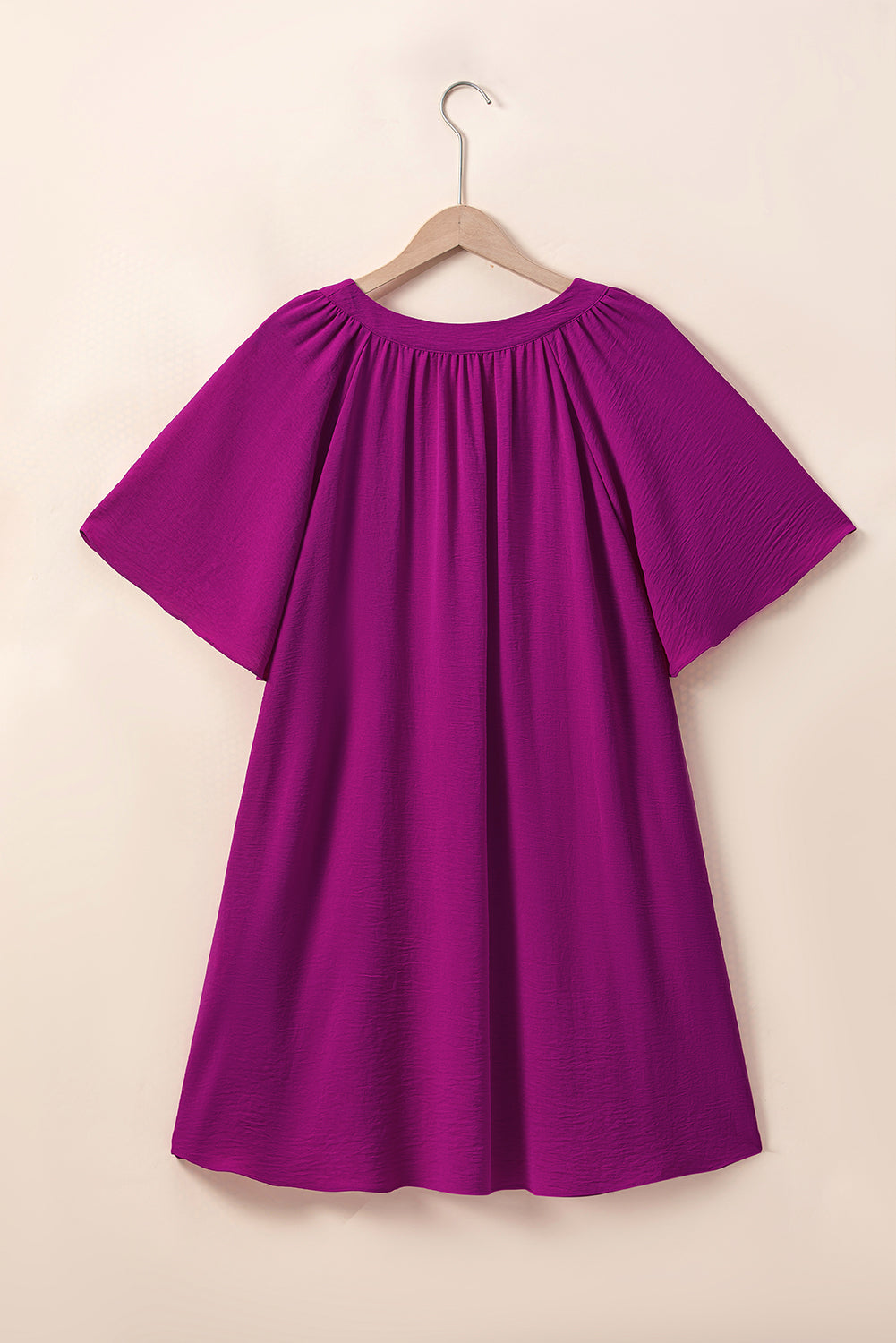 Rose Red Notched Neck Wide Sleeve Pleated Plus Size Dress