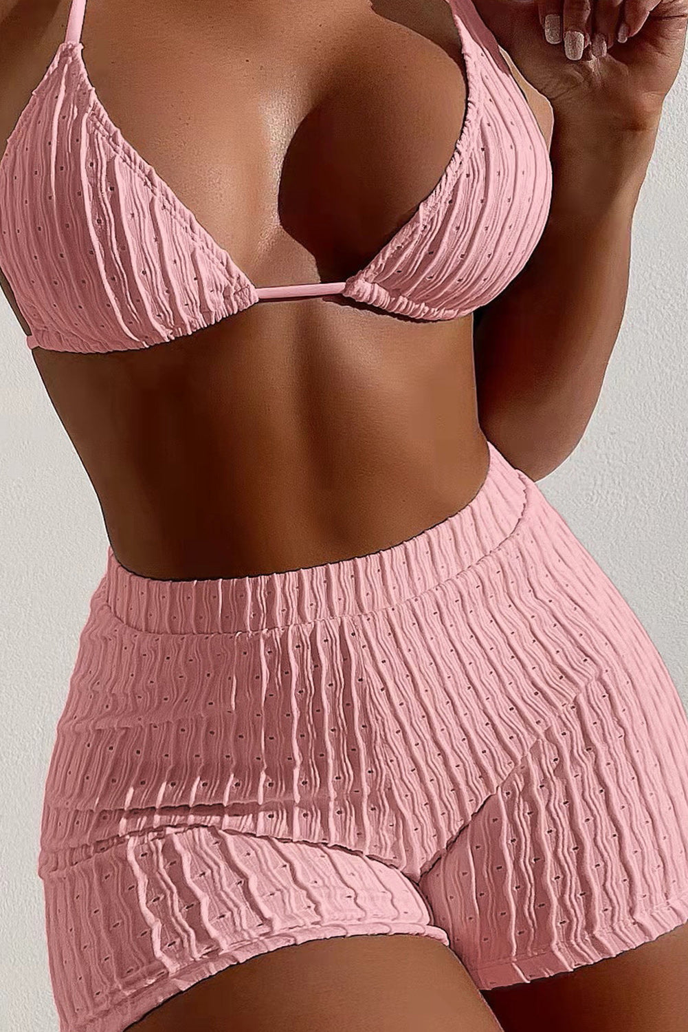 - It features eyelets or raised patterns that add depth and dimension to the swimwear