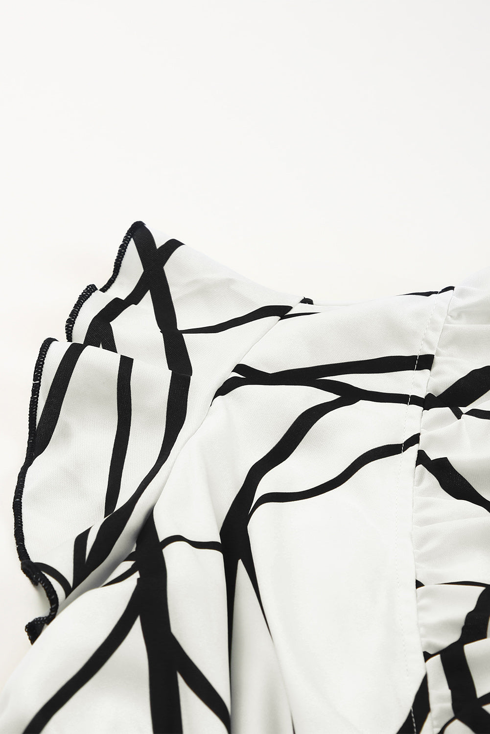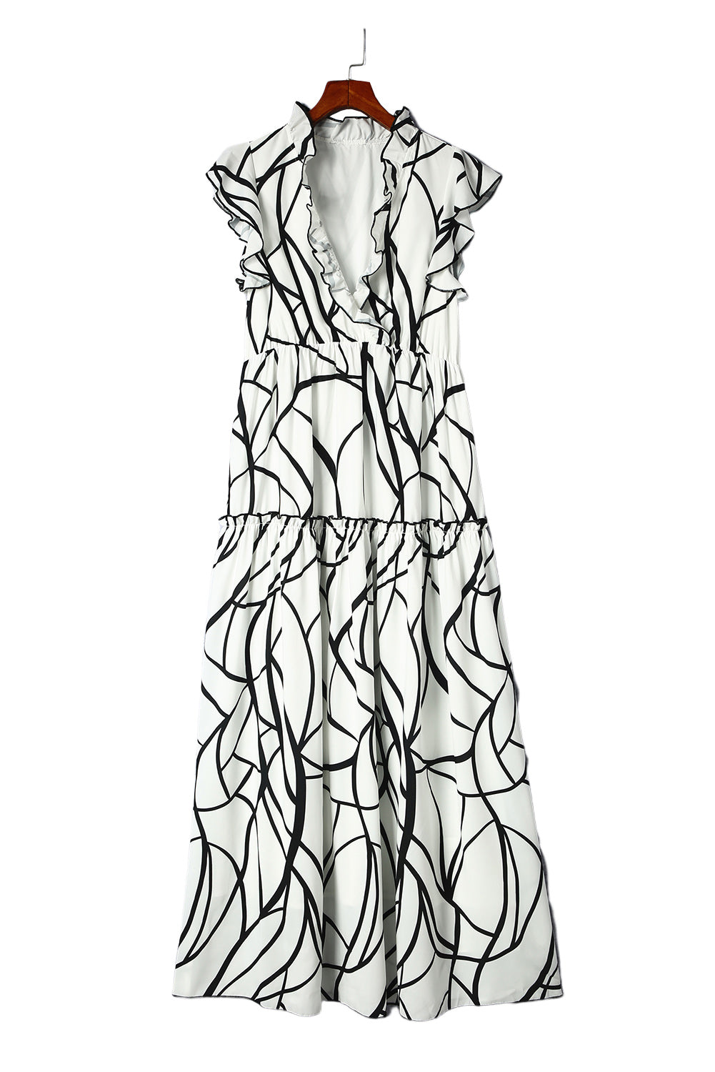 White Abstract Vein Print V Neck Ruffle Maxi Dress
