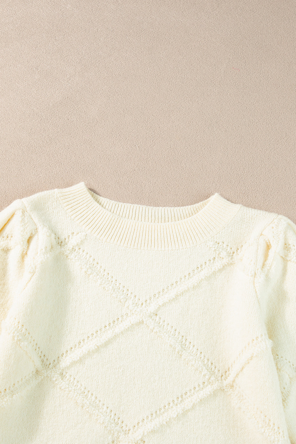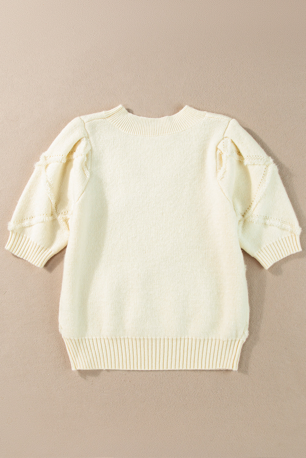 White Rhombus Pattern Ribbed Trim Short Sleeve Sweater